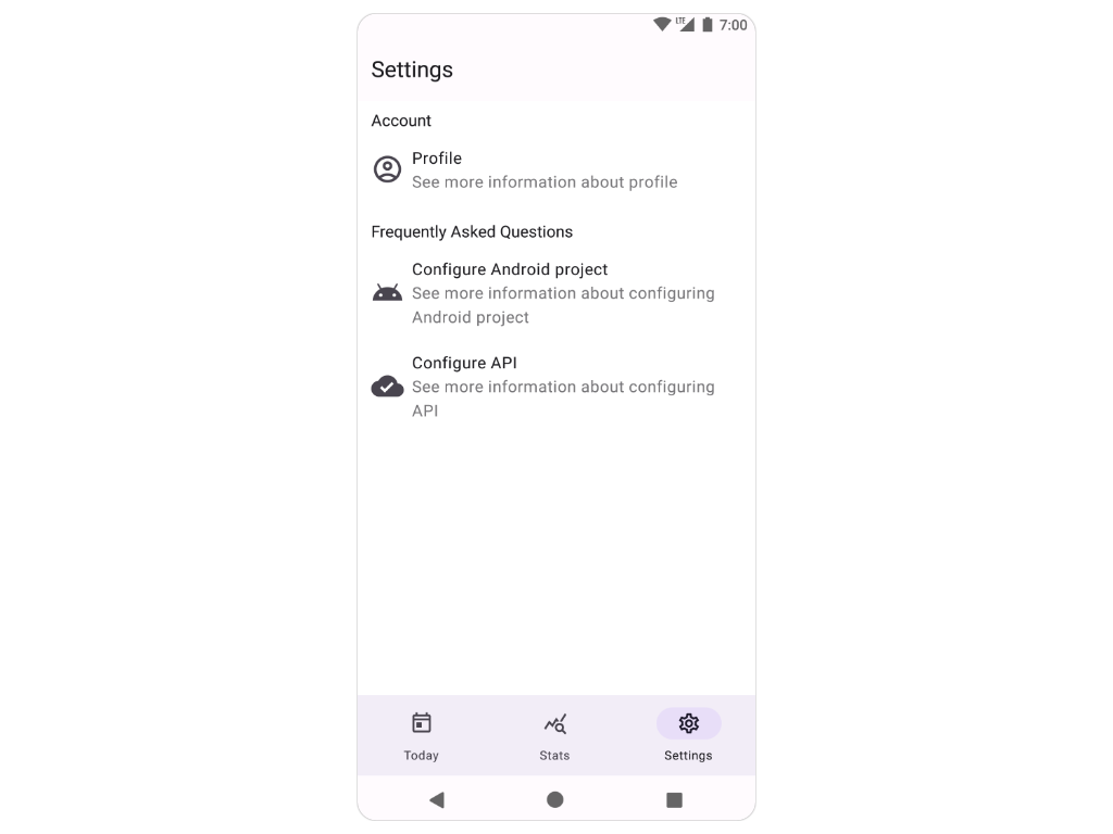 Let's take create a test that verifies that the "Settings Screen" has the "Account" and "Frequently Asked Questions" sections which are non-clickable.