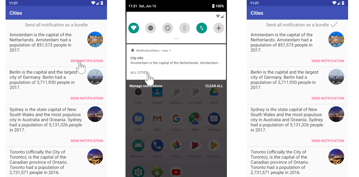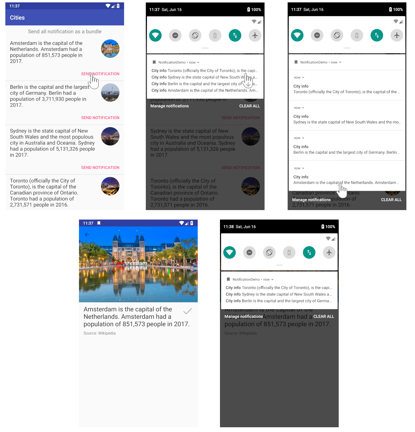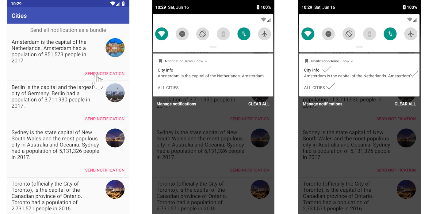Notification can be grouped for better UX and readability on different devices. We should swipe for bundle notification for expanding list of notifications in this bundle. It means that after notification verification we can swipe down and verify one of notification with click on this notification for checking information about the city.