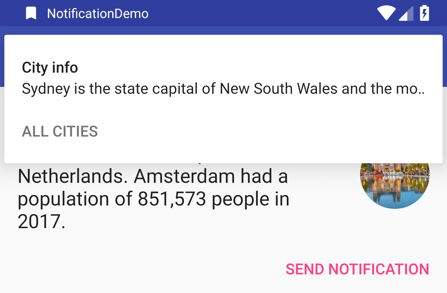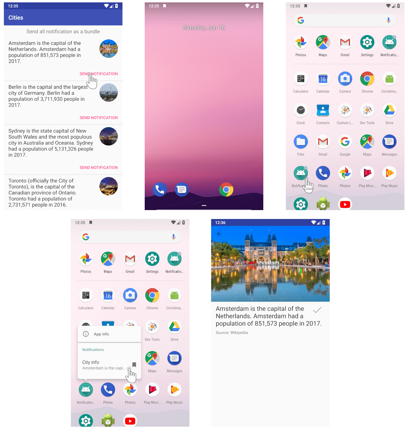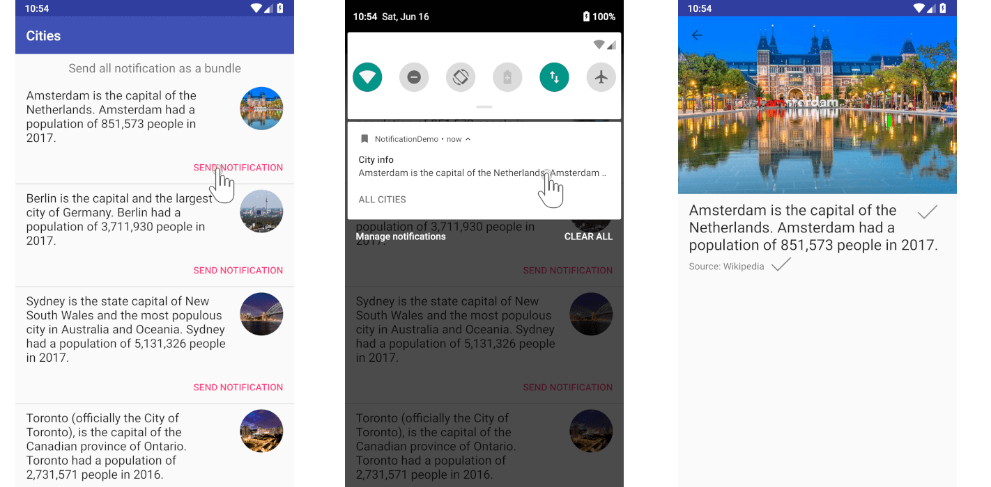 Notification can be grouped for better UX and readability on different devices. We should swipe for bundle notification for expanding list of notifications in this bundle. It means that after notification verification we can swipe down and verify one of notification with click on this notification for checking information about the city.