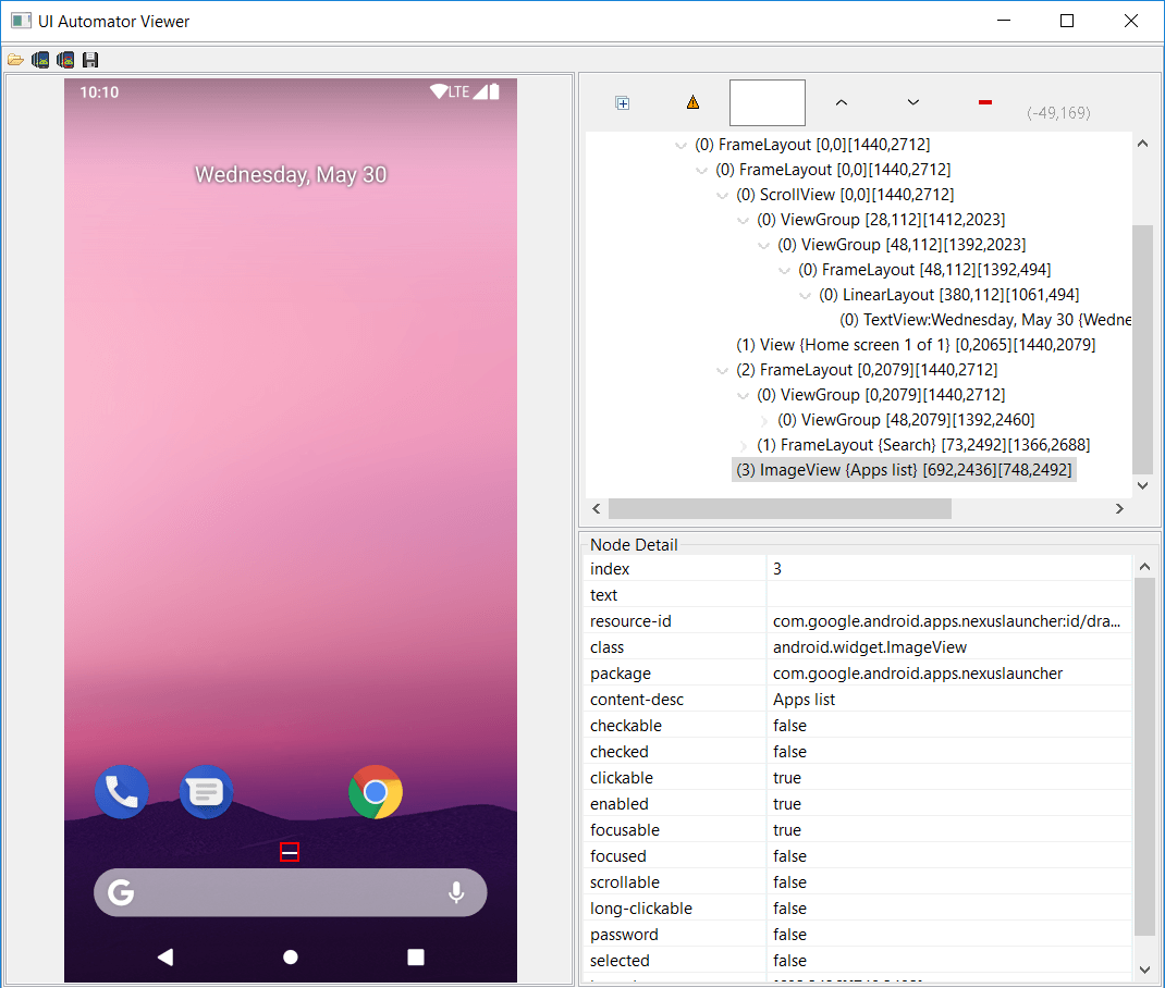 UiAutomatorViewer is a tool which provides information about any view on the screen; it means that we can explore IDs of different applications, like Launcher. It allows you to create test cases with UiAutomator which interacts with any application. In this way, we can test the "Notification badge" feature, open links from any application via your browser (if you created browser).