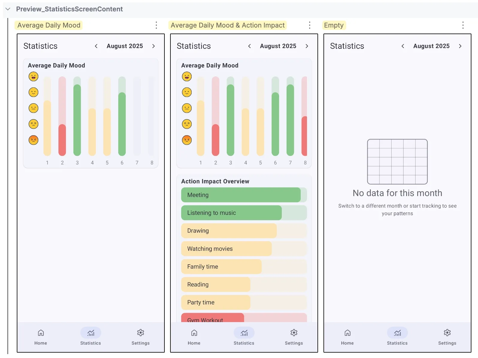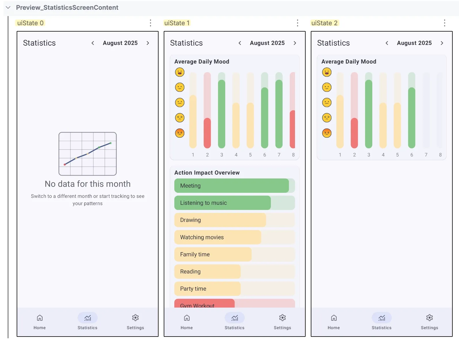 Instead of writing separate preview functions for each UI state (empty, loading, success, error), you create one provider that supplies multiple states to a single preview function. Let’s look at examples of testing different states of the Statistics screen. Here we want to verify empty and two states when different data are available.