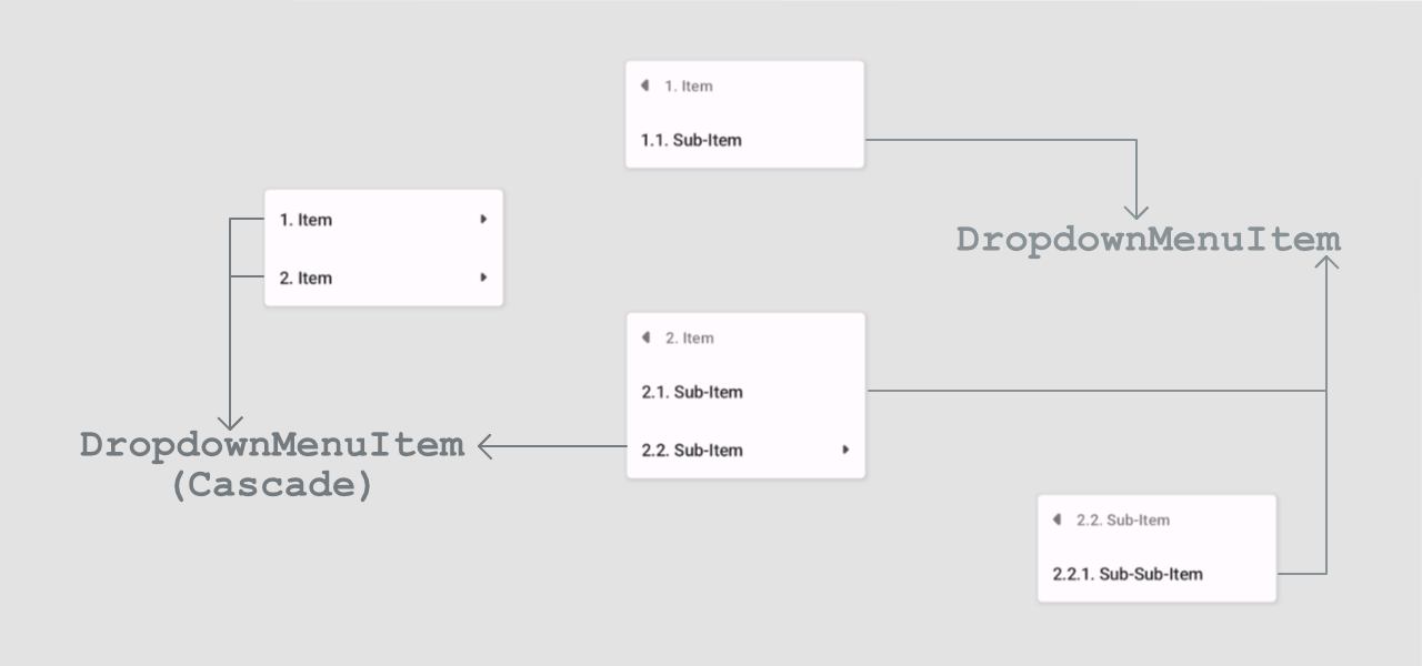 The next step is to create a nested dropdown menu. If we want to use the CascadeDropdownMenu we will have the following structure: