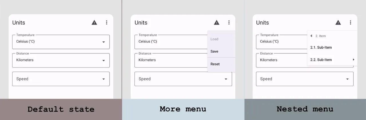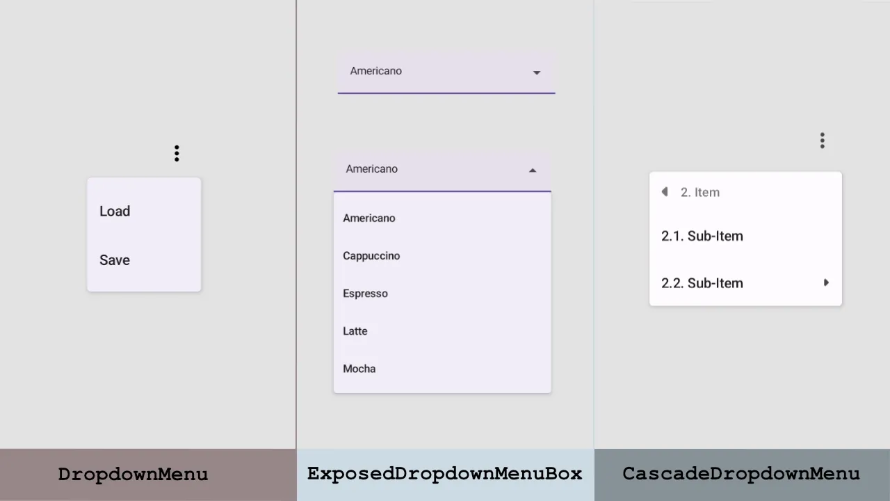 Mobile apps have limited space for displaying content on the screen. The component which helps us to save space and show a list of options to choose from is the dropdown menu. The "Material 3" library contains a few implementations of the dropdown menu. Besides that, the cascade library simplifies building nested pop-up menus in the Jetpack Compose.
