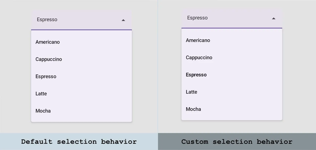 ExposedDropdownMenuBoxdisplays the selected item and an expandable list of options.