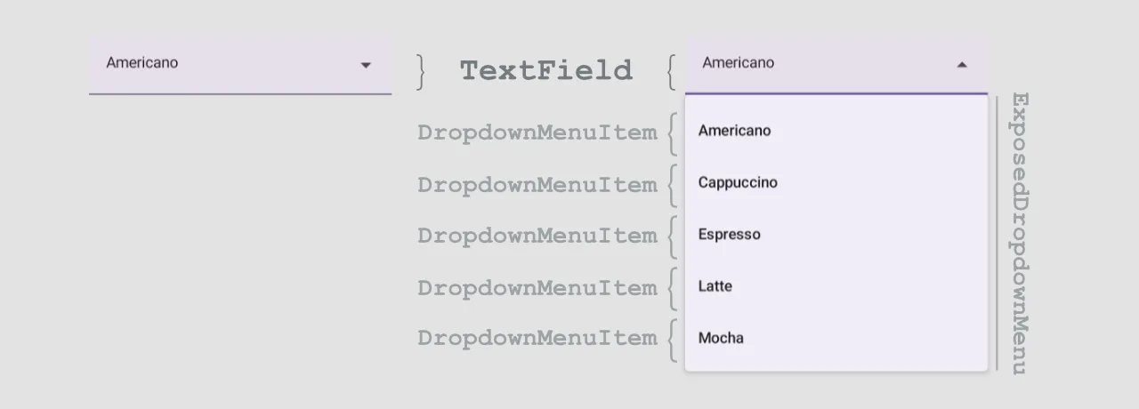 The ExposedDropdownMenuBox allows us to create a dropdown menu component with a TextField which shows the selected item.