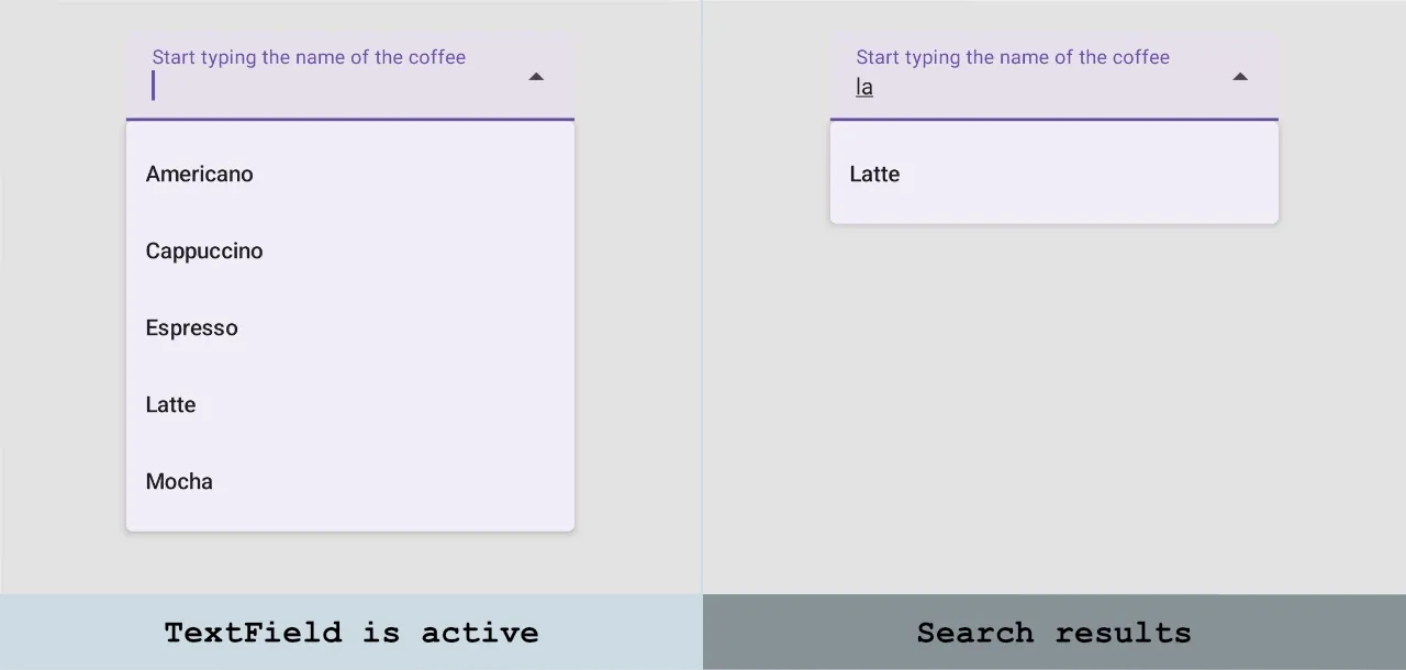 Let's implement the ExposedDropdownMenuBox component with a list of coffee drinks.