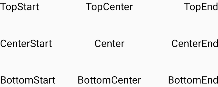 Text(text = "TopStart", modifier = Modifier.align(Alignment.TopStart))
