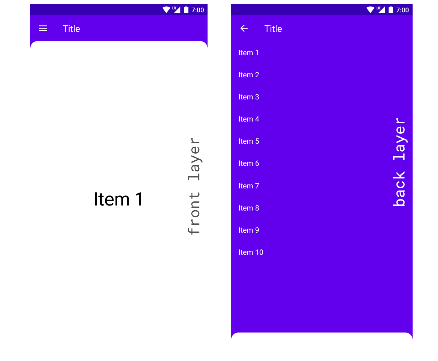 - The "BackdropScaffold" layout contains a basic implementation of the material design backdrop.