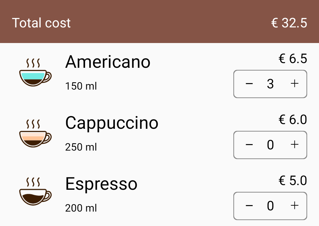 Having possibilities of Composable functions in mind we can explore the state of composable functions. Let's build a list of coffees which can be ordered in any amount.
