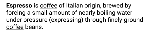 val description = "Espresso is coffee of Italian origin, brewed by forcing a small amount of nearly boiling water under pressure (expressing) through finely-ground coffee beans."