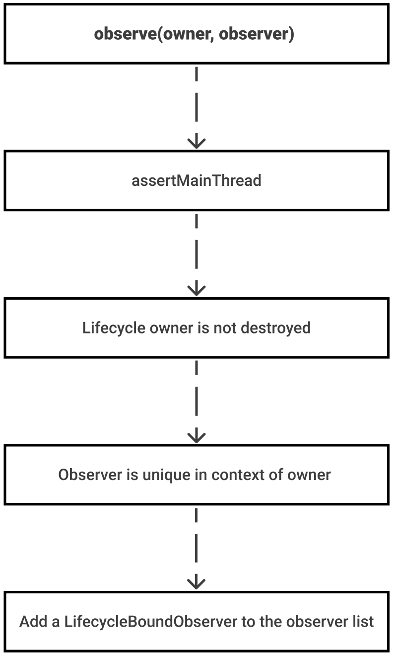 Let's start with the internal work of the observe method because one of the parameters in this method is the LifecycleOwner and it adds an observer to the observer list. The following code demonstrates it: