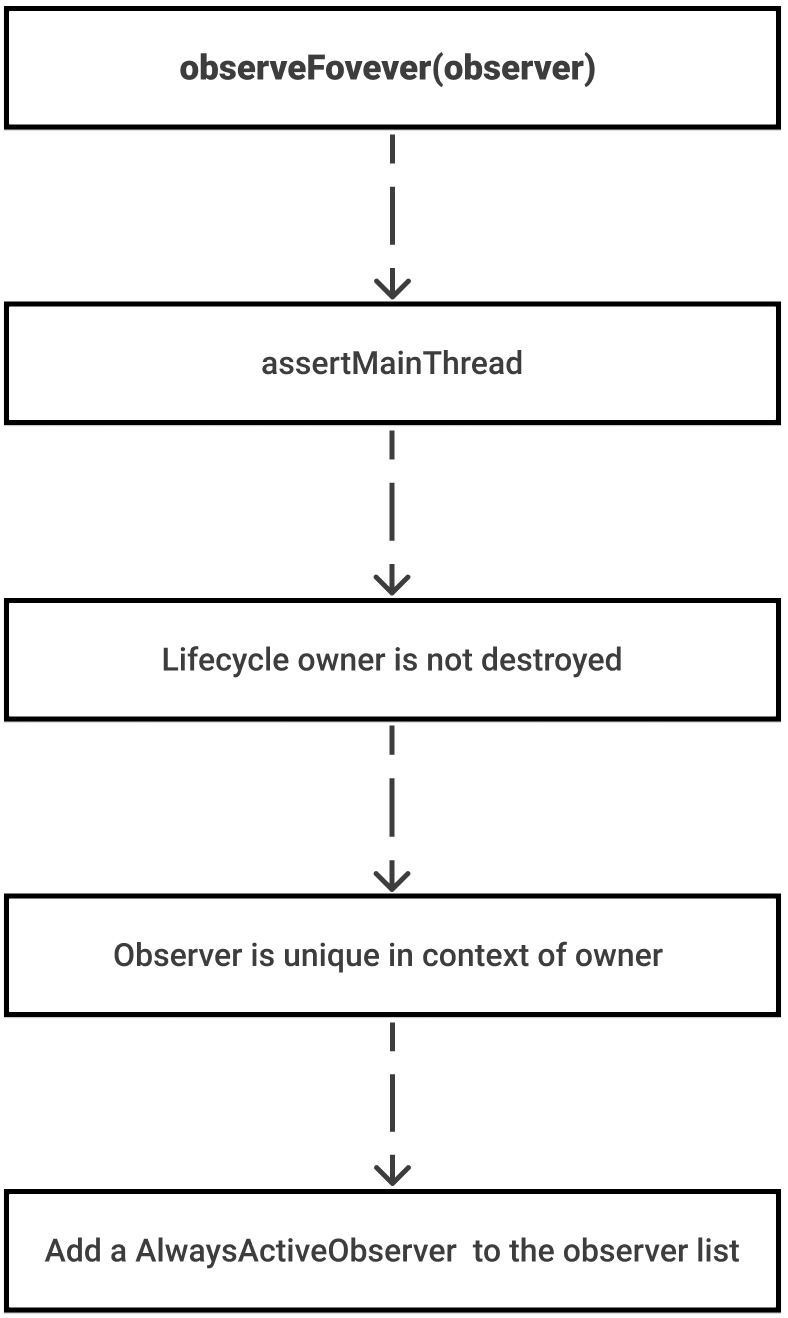 Before adding "always active observer" (new AlwaysActiveObserver(observer)) to the observer list we have, the implementation of the observeForever function should go through a few checks: