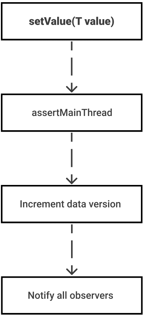 In the beginning, the function checks that we want to set a value from the main thread. The next step is to update the version of the data and the data itself. Afterward, all observers on the observer list get new data.