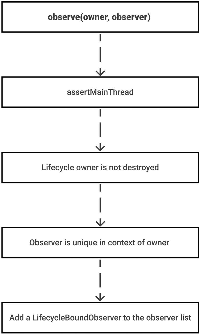 The same situation will happen with the reading value of the LiveData object. If we check the observe method’s internal implementation, we can see that this method can be used only from the main thread.