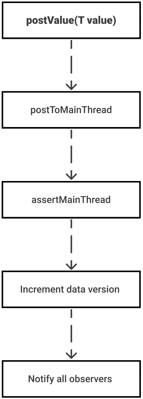 This means that we will often change threads (worker thread → main thread) when we want to update the LiveData object.