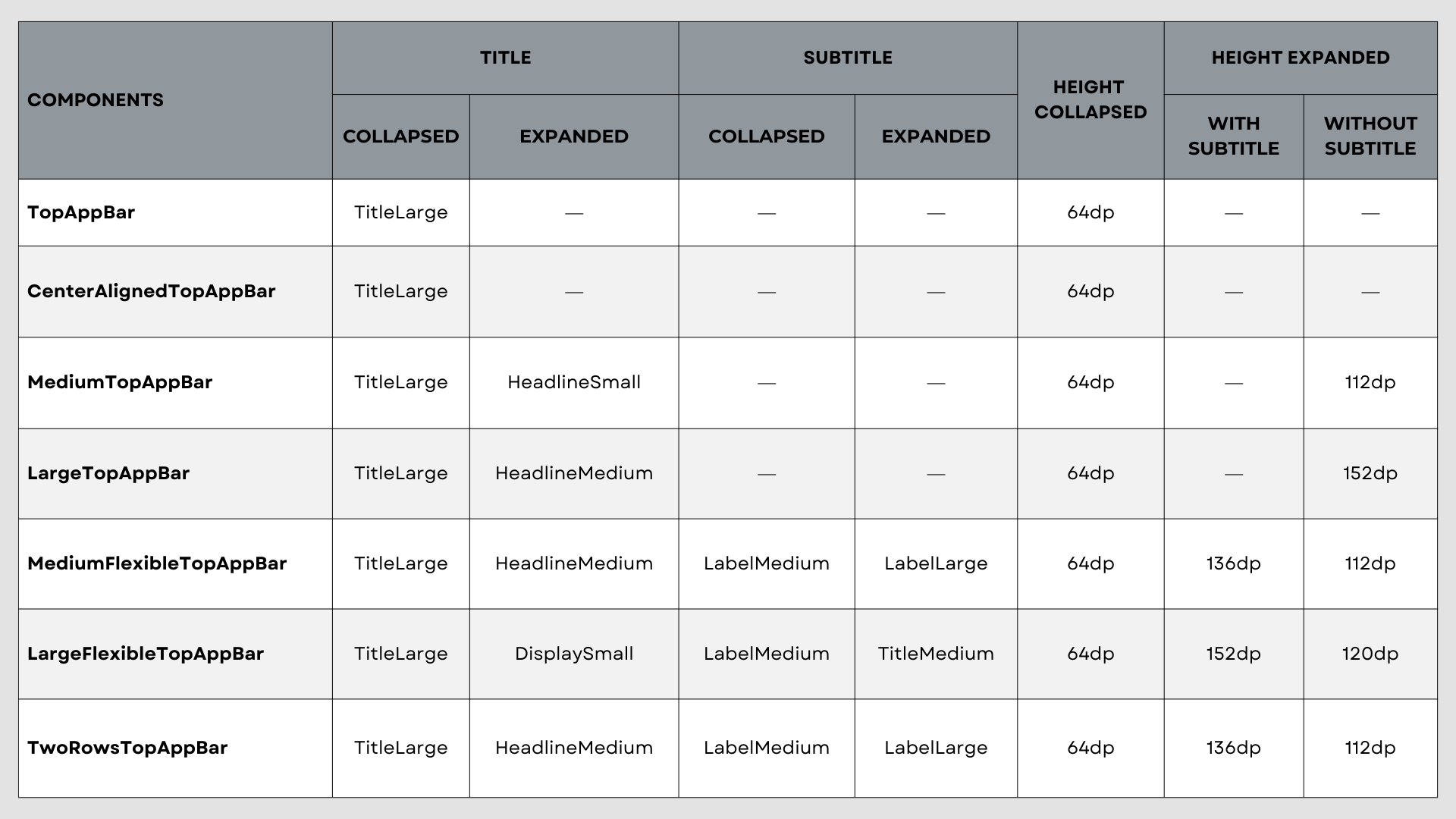 | Expanded Height (without subtitle) | 112dp | 120dp |