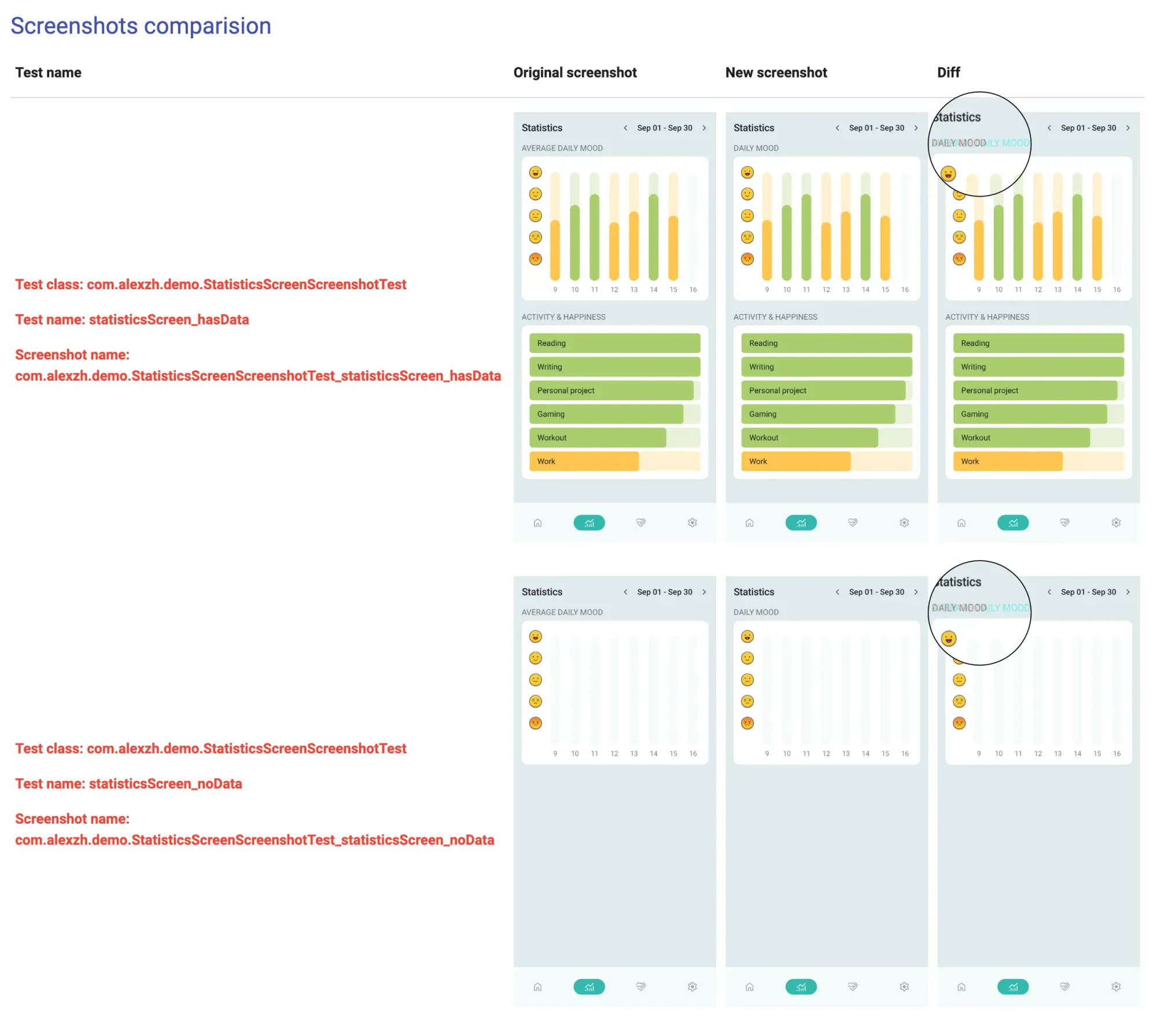 Let’s explore two screenshot tests for the statistics screen for the mood tracker app using the Shot framework. The tests will focus on the UI states representing Empty and Success states (data available for chart rendering).